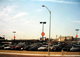 写真は、空港の駐車場。彼方に、LAXのシンボルが見えます。