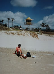 M氏です。上の写真と、人物対比、ってことで。下のは、私です。 散歩している間に、波乗りしている人を見かけたので(しかも、ひとりしかいなかったよ。シーズンになると、ここは海水浴客で、ものすごい混雑になるようですが、シーズンオフなので、静かでした)、