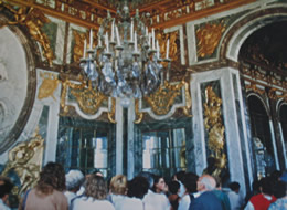 ベルサイユは、壁一面に、彫刻や絵画があり、その多さだけでも圧倒されるのですが、ここはいかにも男性の間、という感じが面白かった。この間の入り口には、ナポレオンのアルプス越えの絵が飾ってあり、カッコイイ部屋でした。写真に撮ったけど、ブレた。写真は、鏡の回廊の手前にある、シャンデリア。ここは、戦争の間。