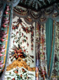 マリーアントワネットのベッド。天蓋つきです。 内部は、王の中庭(ベルサイユ入り口)から入って、礼拝堂の穹窿(きゅうりゅう)、ヘラクレスの間、アポロンの間などを通り、外へ出ました。