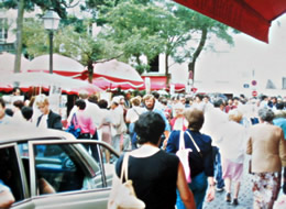 あけて翌日。同行者のU氏と、メトロに乗り、ジョルジュ・サンクへ。自由行動の日でした。 実は、ホテルが、ラ・デファンス地区の入り口の、ノボテル・ラ・デファンスだったため、交通機関が車しかなく、地下鉄の終着駅まで、以前は、歩いて出なければなりませんでした。今では、近代的なビル群が立ち並び、日本の都心部と変わらない風景を見せていますが、当時はまだほとんどホテル以外の建物が無く、がらんとしていて、ちょっとさみしい感じ。ガイドブックなどにも、このあたりは当時載っていなくて、どうなっているのか判らず、少々不安だったことを思い出します。道そのものは非常に広く(ラ・デファンス地区)、高速道路なみのスピードで車が走っていった。6車線あり、横断歩道が一箇所しかなくて (ホテル周りに)ビジネスマンの多い、静かなホテルだったことを覚えています。