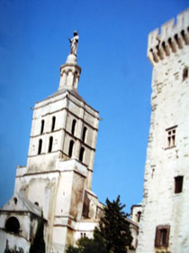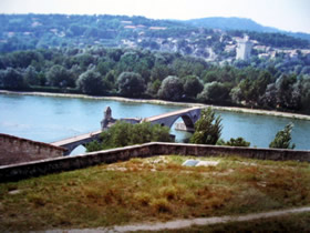 このあと、ようやくあの、アヴィニョン橋へ。 またこれが例によって、すばらしくいい天気で(私は晴れ女)、セーヌ川にかかる、ほそーい、けど有名な歌の橋、バスを降りてその橋まで行き、ちょっと歌の通りに、ポーズをとってみたのですが。