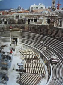 アルルの闘技場。このアルルの闘技場は、映画「タクシー2」で、出てきました。このあたりは、闘技場が丘の上に立っているところが多く、バスも入っていけないような、せまい道がとてもたくさんありました。とても古い町で、歩いているだけでも、絵になるところがたくさんあります。こぢんまりしているため、寂しいと感じる人もいるかも知れません。が、日本でよく見かける、作られたヨーロッパの町並、というのとは違い、とても情緒のある雰囲気。コンクリートの町並みで、場になれてしまうと、ちょっと物足りない感じがしますが、帰ってきてから改めて撮った写真を見ると、意外に、いいんですね。日本人が想像している、よく日本の新しいテーマパークなどでみるものとは、かなり雰囲気が違いますが(あれは、日本人向けに、繊細な景色にしているようです)。